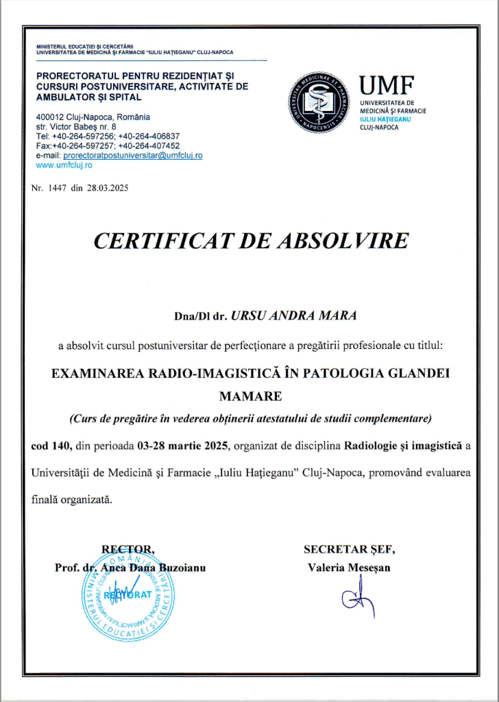 Am urmat cursurile și am promovat examenul pentru supraspecializarea în Senologie la Universitatea de Medicină și Farmacie „Iuliu Hațieganu” Cluj-Napoca, consolidându-mi expertiza de peste 6 ani în acest domeniu.